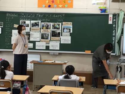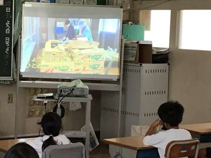今日は1年生が「給食はだれがつくっているのかな?」の学習を栄養職員さんと一緒にしていました。中部給食センターの調理員さんたちの様子をDVDで見せてもらい、「重いものなのに軽そうだね」「力もちだね」と、つぶやいていました。