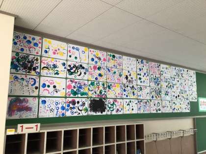 1年生昇降口の掲示板には、とても鮮やかな作品が飾ってありました。