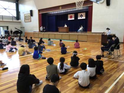 今回は6年生のみ体育館で、他の学年はオンラインで行いました。