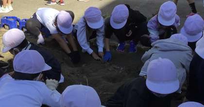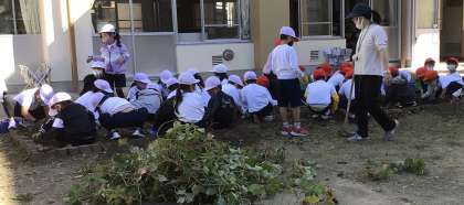 教室前の花壇で、さつまいもほりをしました。みんなで力を合わせると、たくさんのいもが収穫できました。