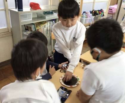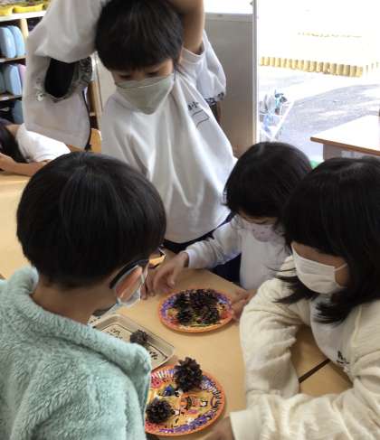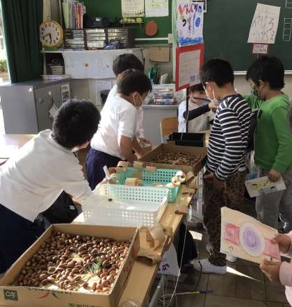 1年生のおもちゃまつり、2回目。今回は、3組がおきゃくさんです。みんなお客さんを呼び込むために、一生懸命声を出していました。