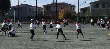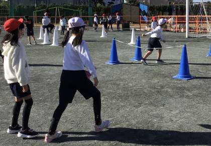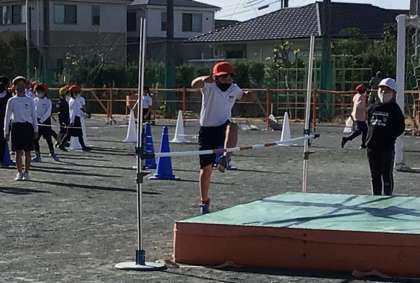 3年生、体育科の授業です。高跳びとしっぽとりの鬼ごっこをしていました。