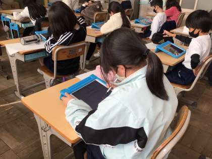 3年生はタブレットのQubenaで、今までの復習に取り組んでいました。