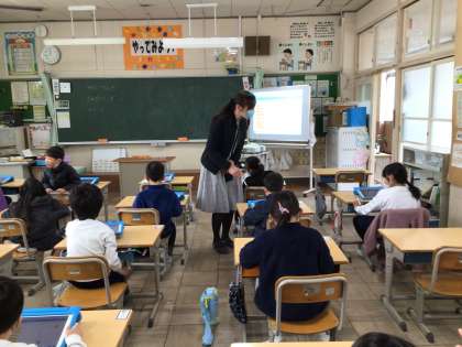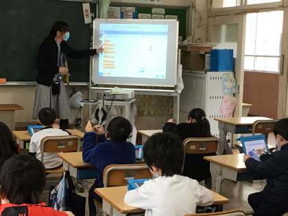 1年1組が支援員さんに教えてもらいながらscratchでプログラミングを勉強しました。
