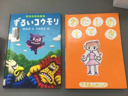 今日読んでもらった本は、朝日小学校3年生の女の子が「手作り絵本コンクール」で優秀賞をもらった作品「わたしのすてき」でした。他には「ずるいこうもり」とクイズを出してもらいました。