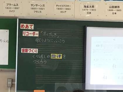音楽の授業で「繰り返しの旋律を作ろう」というめあてで、簡単なメロディーを作ってリコーダー演奏をしました。