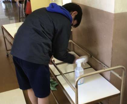 6年生が、ワックスがけと配膳台磨きをしました。床と配膳台がぴかぴかになりました。ありがとうございました。