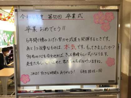 もうすぐ式が始まります。 6年生の廊下にあるホワイトボードに担任からのメッセージが書かれていました。