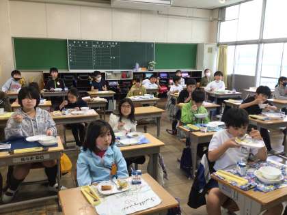 明日は修了式です。今日は今年度最後の給食です。 みんなおいしそうに食べています。