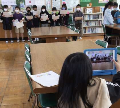 国語の音読発表会の練習をしているとき、撮影して、よいところと直すところを見つけようと、アイディアが出ました。隣のチームの友達にお願いして、撮影してもらいました。明日の発表会をお楽しみに。
