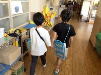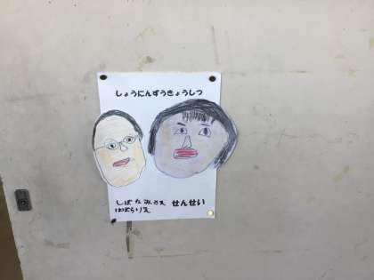 1年生が楽しめるように、説明を工夫したり、それぞれの教室を使っている先生の似顔絵ポスターを作ったり、頼もしい2年生。そのおとなりでニコニコ笑顔の1年生でした。