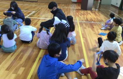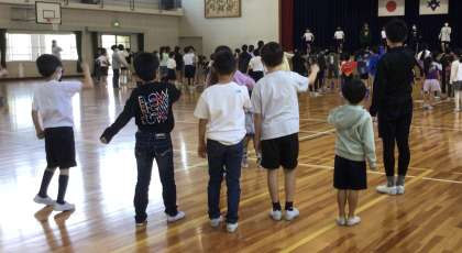 6年生が中心となって、朝日っ子誕生会を行いました。朝日っ子班に分かれて、いくつかゲ−ムをして楽しいひとときを過ごしました。1年生は、プレゼントを受け取り、とても嬉しそうでした。