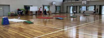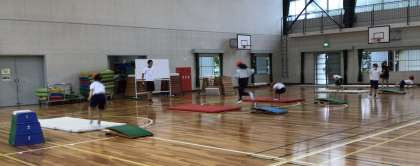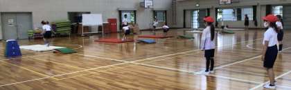 3年生、体育科、跳び箱の授業。両足で踏切板を踏み、マットに両足で着地する練習をしていました。遠くから、力いっぱい走って練習していました。