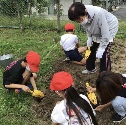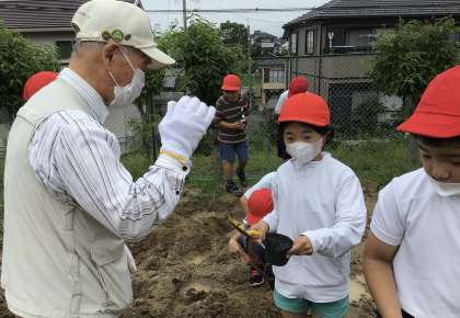 3年生が大豆名人をお招きして、大豆をまきました。