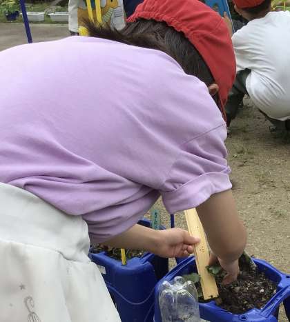2年生が、育てている野菜の大きさをはかったり、様子を観察したりしました。