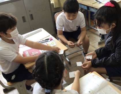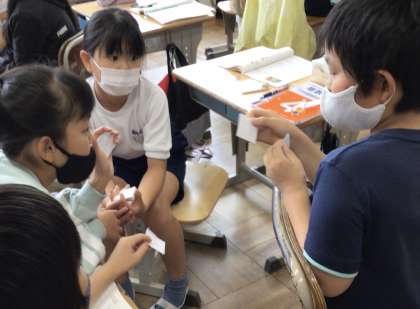 4年生、算数科、各自でかいた図形を、グループで確認し合いました。