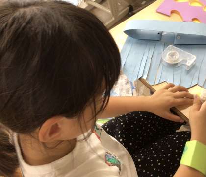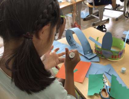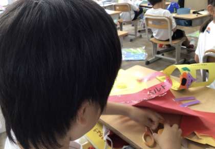 2年生、図画工作科、紙でベルトなどの飾りを作っていました。