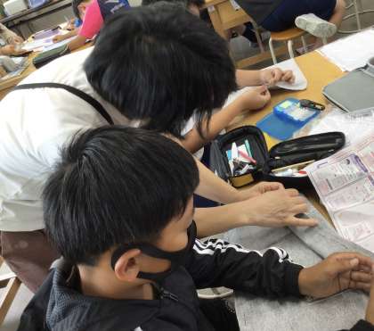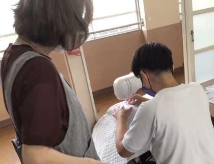 6年生のナップザック作りの授業に、ミシンボランティアさんが来てくださいました。困ったときに相談できるので、安心して進めることができました。
