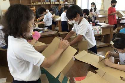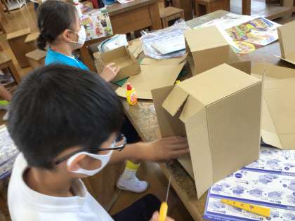 図画工作科、「おもしろいダンボールボックス」ダンボールで自分だけの箱を作っていました。
