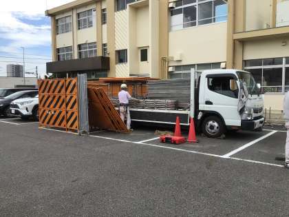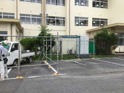 今日から、南校舎の東トイレの工事が始まりました。現場事務所や足場が設置されて、駐車場が狭くなりました。暑い中、工事をする方たちは、一生懸命働いてみえます。新しいトイレが完成するのは、来年1月の終わりです。
