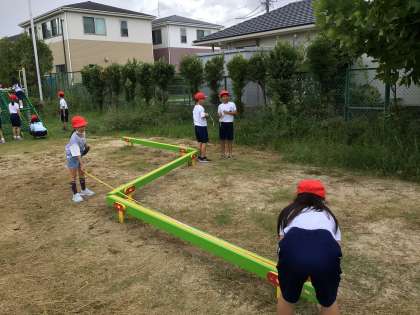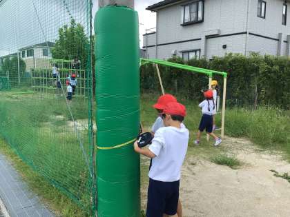 運動場のいろいろなものを、興味津々で測りました。