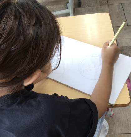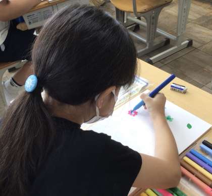 図画工作で、木の板に絵を描いていました。何ができるのか楽しみですね。