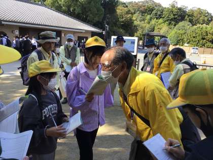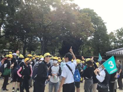 シカがたくさんいました。総合学習のインタビューもしています。学ぶことも忘れていません。法隆寺へ向かいます。