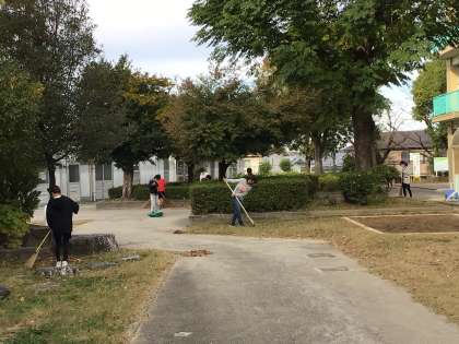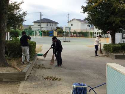 6年生が学校の敷地内の落ち葉の掃除を
