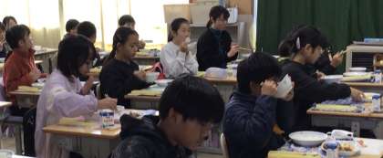 いつもおいしい給食を作ってくださる調理員さんが、給食を一緒に食べてくださいました。おいしそうに食べる子どもたちを見て、嬉しかったとおっしゃいました。給食を作るときに使う大きな道具を紹介してくださいました。