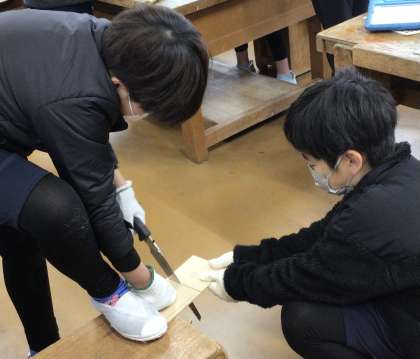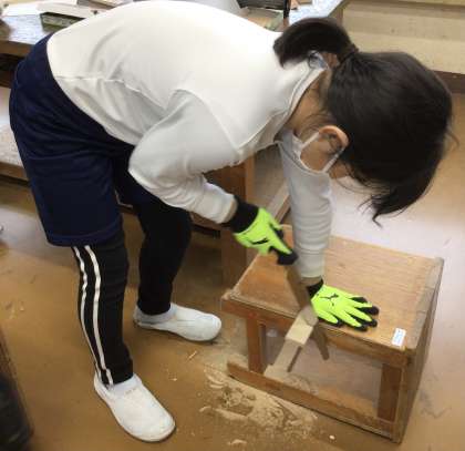 4年生が図画工作の授業「ギコギコ トントン クリエイター」で、のこぎりをひいたり、かなづちで打ちつけたりして作品を作っていました。とても集中して取り組んでいました。