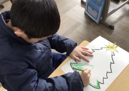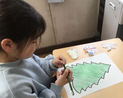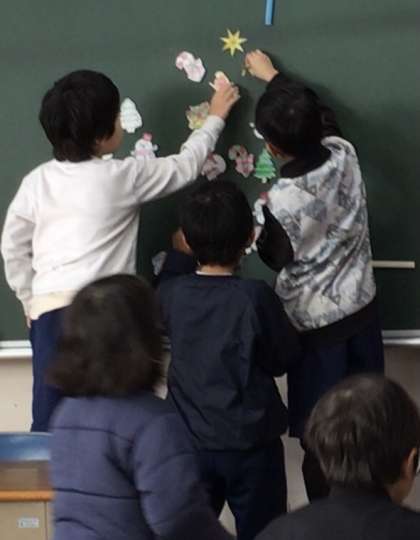 2年生が、外国語に親しむ活動で、クリスマスツリーを作っていました。