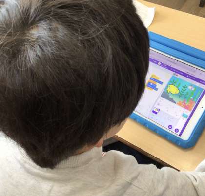 2年生が、ICT支援員さんとプログラミングの授業をしました。いろいろな速さで、魚を動かしていました。