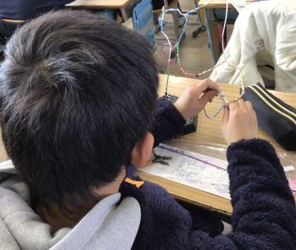 5年生が、図画工作の授業で、針金を使った作品を作っていました。