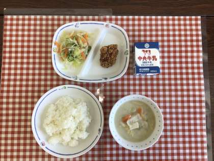 今日の給食は、『ごはん、豆乳のバランスみそ汁、和風サラダ、とり肉のから揚げ、牛乳』です。