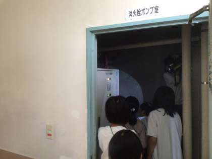 社会科の授業で「水はどこから」の学習をしています。校内にある消火栓ポンプ室と受水槽を見に行きました。