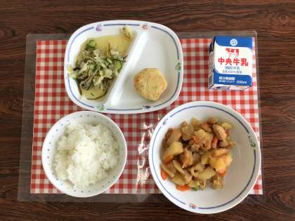 今日の給食は、『ごはん、とり肉と野菜のうま煮、キャベツの昆布あえ、豆腐しんじょ、牛乳』です。
