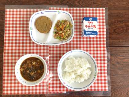 今日の給食は、『ごはん、じゃがいものみそ汁、大豆のピリ辛炒め、はんぺん、牛乳』です。