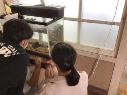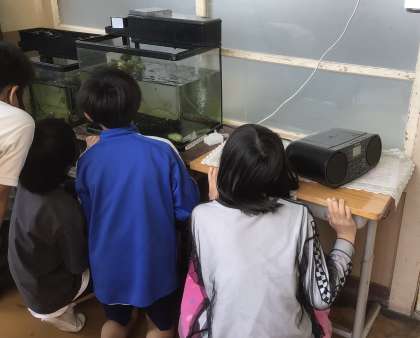メダカをはじめてじっくりと観察しました。オスとメスの違いを学習していきます。