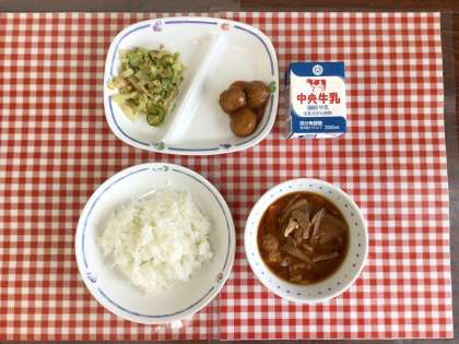 今日の給食は、『ごはん、豚汁、和風サラダ、肉だんご、牛乳』です。