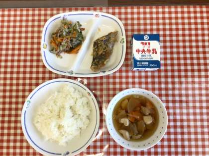今日の給食は、『ごはん、かしわ汁、ゆかりあえ、さわらの香味ソースかけ、牛乳』です。