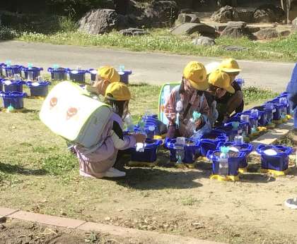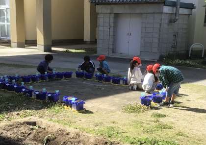 登校したらすぐにアサガオに水やりをしています。アサガオの花が咲くのが楽しみです。