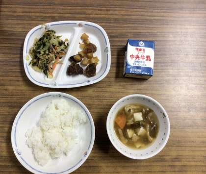 今日の給食は、『ごはん、あおさ汁、おかかあえ、レバーとじゃがいもの甘辛煮、牛乳』です。