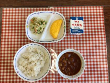 今日の給食は、『麦ごはん、ハヤシライス、ビーンズサラダ、オムレツ、牛乳』です。