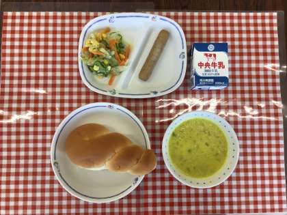 今日の給食は、『ツイストパン、豆乳のカレースープ、フレンチサラダ、ウインナー、牛乳』です。