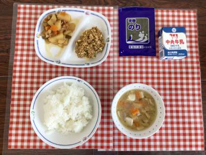 今日の給食は、『ごはん、麦みそ汁、じゃがいもとツナのうま煮、納豆まき、手巻きのり、牛乳』です。