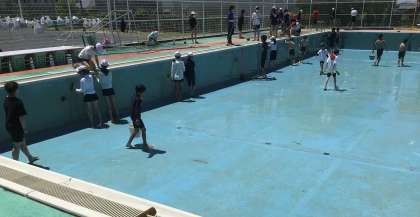 来週から始まる水泳学習に向けて、6年生全員でプールを掃除しました。落ち葉や泥で汚れていたプールが、6年生のみなさんの頑張りによって、とてもぴかぴかになりました。6年生のみなさん、ありがとうございました。