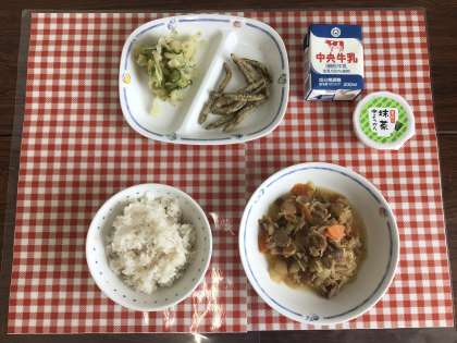 今日の給食は、『麦ごはん、とよたひまわりポーク丼の具、たくあんあえ、きびなごのから揚げ、抹茶水ようかん、牛乳』です。