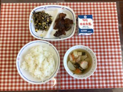 今日の給食は、『ごはん、花ふのすまし汁、切り干し大根とひじきのサラダ、レバーと大豆のみそがらめ、牛乳』です。