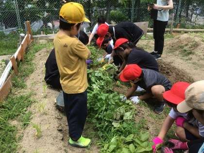 畑で育てていたジャガイモを、みんなで収穫しました。たくさん収穫できたので、みんな大喜びでした。