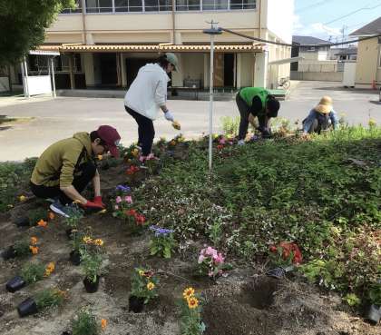 グリーンボランティアのみなさんが、円形花壇に花の苗を植えてくださり、とても華やかになりました。ありがとうございました。
